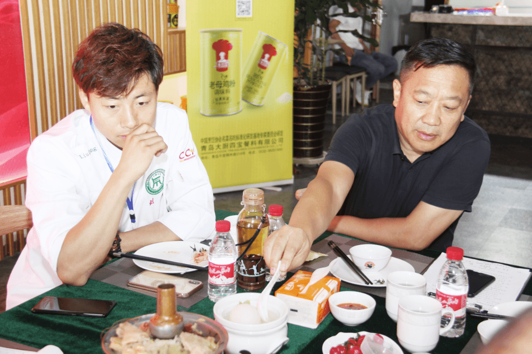 大厨四宝董事长与评委刘强大师一起品鉴菜品。